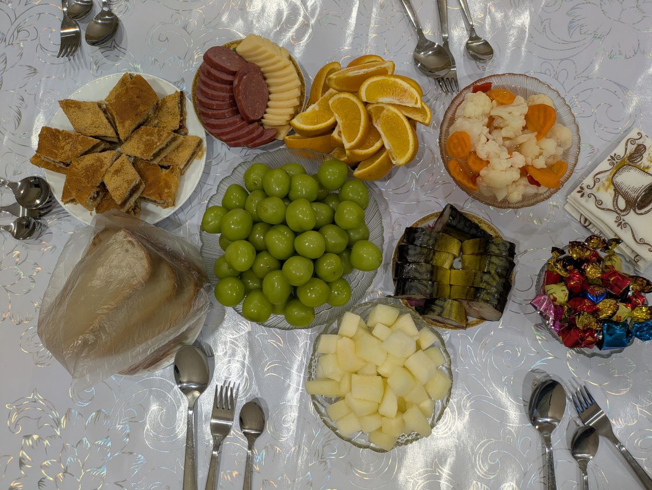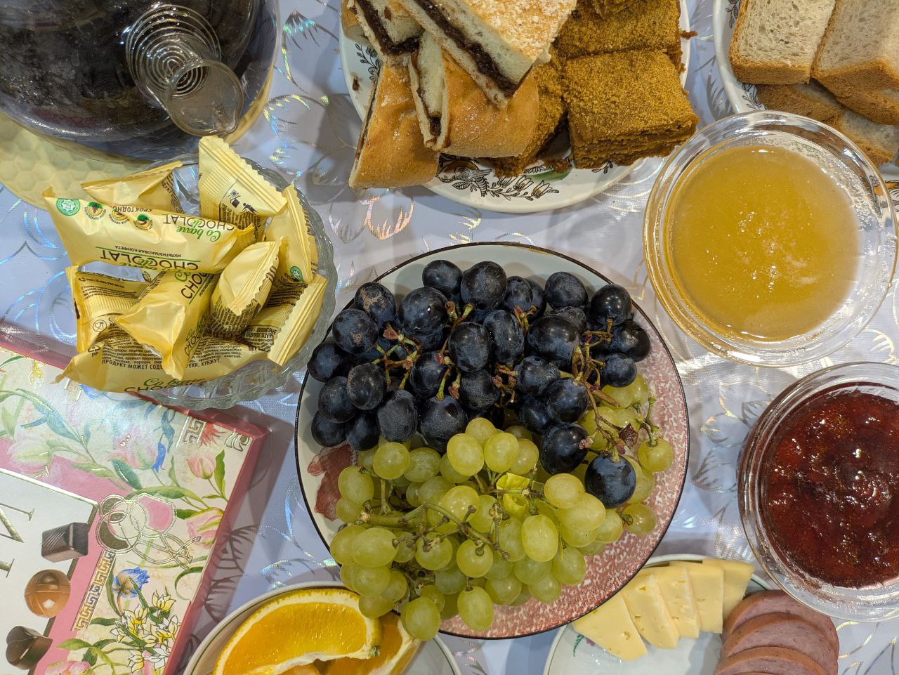 This photo was taken after dinner time. There are pies, a honey cake (Medovik), bread, candies, green and blue grapes, honey, strawberry jam, oranges, cheese, and sausage. For the first course, we ate manti with beef. For the second course, we just had tea