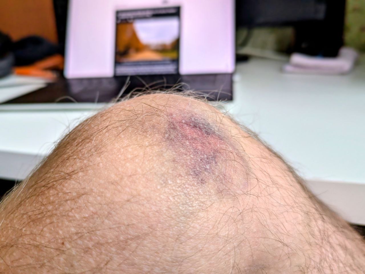 The result of my bike accident — this is my knee. I hit it on a tree. I hope it’s nothing serious and the pain will go away soon